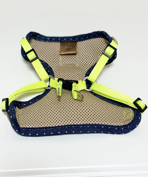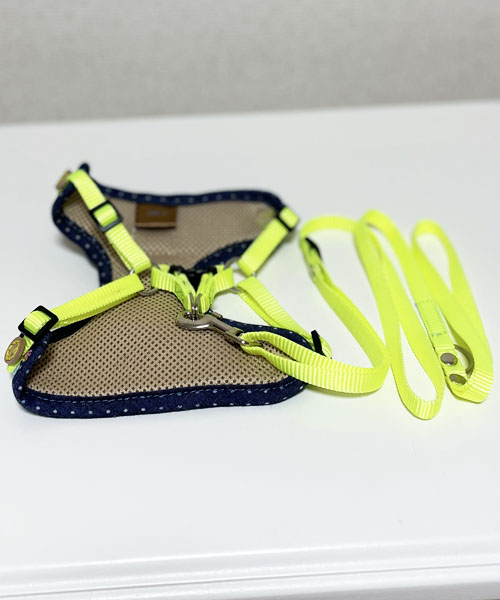 胴回りは調節可能。オシャレなネオンカラーのリーシュ付き。